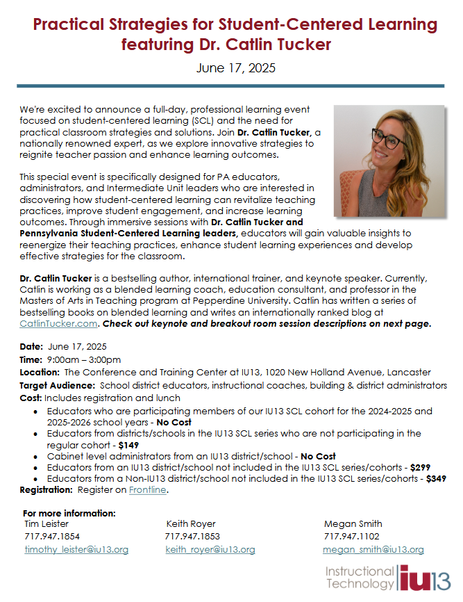 The Educational Technology Team resides in the Instructional Services Department at Lancaster-Lebanon Intermediate Unit 13. As a team, we provide direct support for Lancaster-Lebanon Virtual Solutions (LLVS), the Instructional Media Services (IMS), and our Instructional Technology Services/Programs for our public districts and nonpublic schools. Effectively integrating technology into instruction is ever-changing and growing exponentially. The primary objective is to lead Educational Technology initiatives and provide innovative and future-focused solutions that support today’s learners.